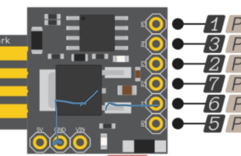 3. Припаиваем кнопку к пинам gnd и P1: